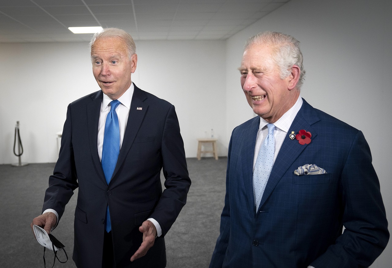 Na snímke sprava Charles a americký prezident Joe Biden