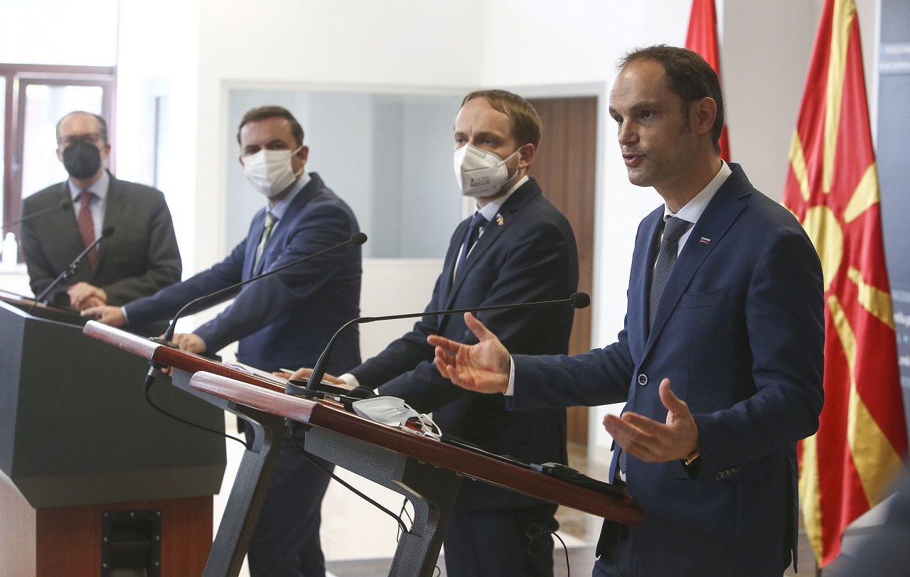 Sprava slovinský minister zahraničia, druhý Alexander Schallenberg, Bujar Osmani a Jakub Kulhanek po stretnutí v budove ministerstva zahraničia v Skopje