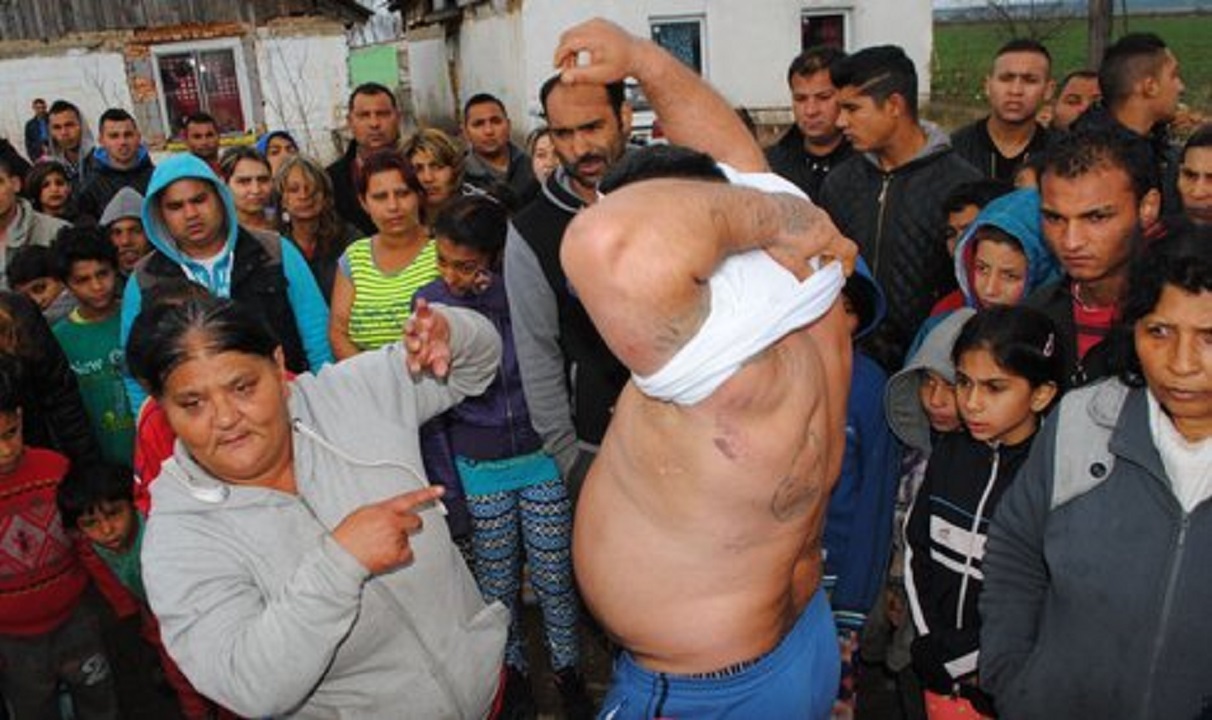 Na snímke zbití Rómovia v Moldave nad Bodvou