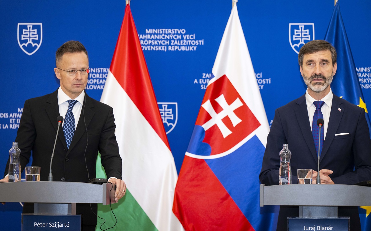 Na snímke zľava maďarský minister zahraničného obchodu a zahraničných vecí Péter Szijjártó a minister zahraničných vecí a európskych záležitostí SR Juraj Blanár (Smer-SD) / Foto: TASR-Jakub Kotian