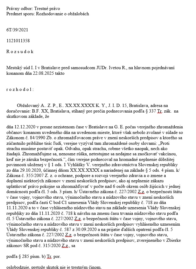 O sprístupnenie anonymizovaného znenia rozsudku (vrátane odôvodnenia) vyhláseného na Mestskom súde Bratislava I v trestnej veci obžalovaného MUDr. Petra Liptáka – pre prečin podnecovania, skutok súvisiaci s verejným zhromaždením v decembri 2020 – sme požiadali Mestský súd Bratislava I podľa § 14 zákona č. 211/2000 Z. z. o slobodnom prístupe k informáciám. V ďalšom texte vychádzame z odpovede na našu infožiadosť, ktorej prílohou bolo anonymizované rozhodnutie v danej veci.
