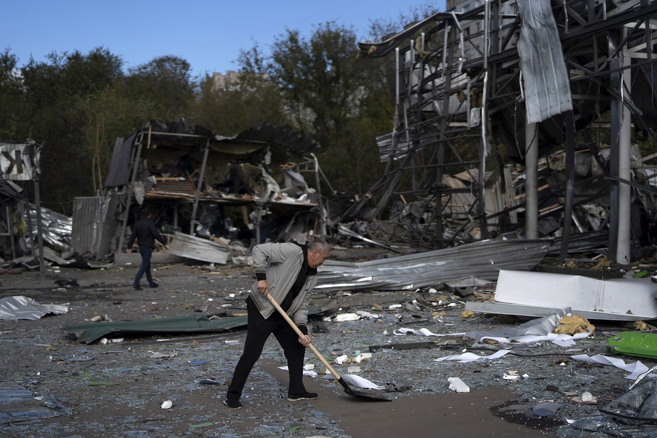 Zamestnanec upratuje pred predajňou s autami, ktorú zničil ruský raketový útok v meste Záporožie na juhu Ukrajiny v utorok 11. októbra 2022