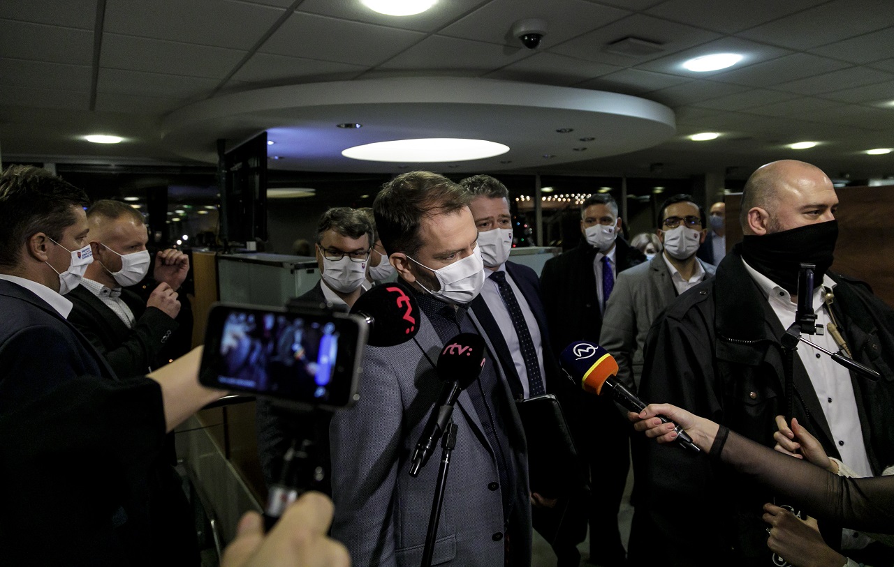 Na snímke zľava podpredseda vlády SR Štefan Holý, predseda vlády SR Igor Matovič a minister vnútra SR Roman Mikulec odchádzajú po zasadnutí Ústredného krízového štábu (ÚKŠ) 8. decembra 2020 v Bratislave