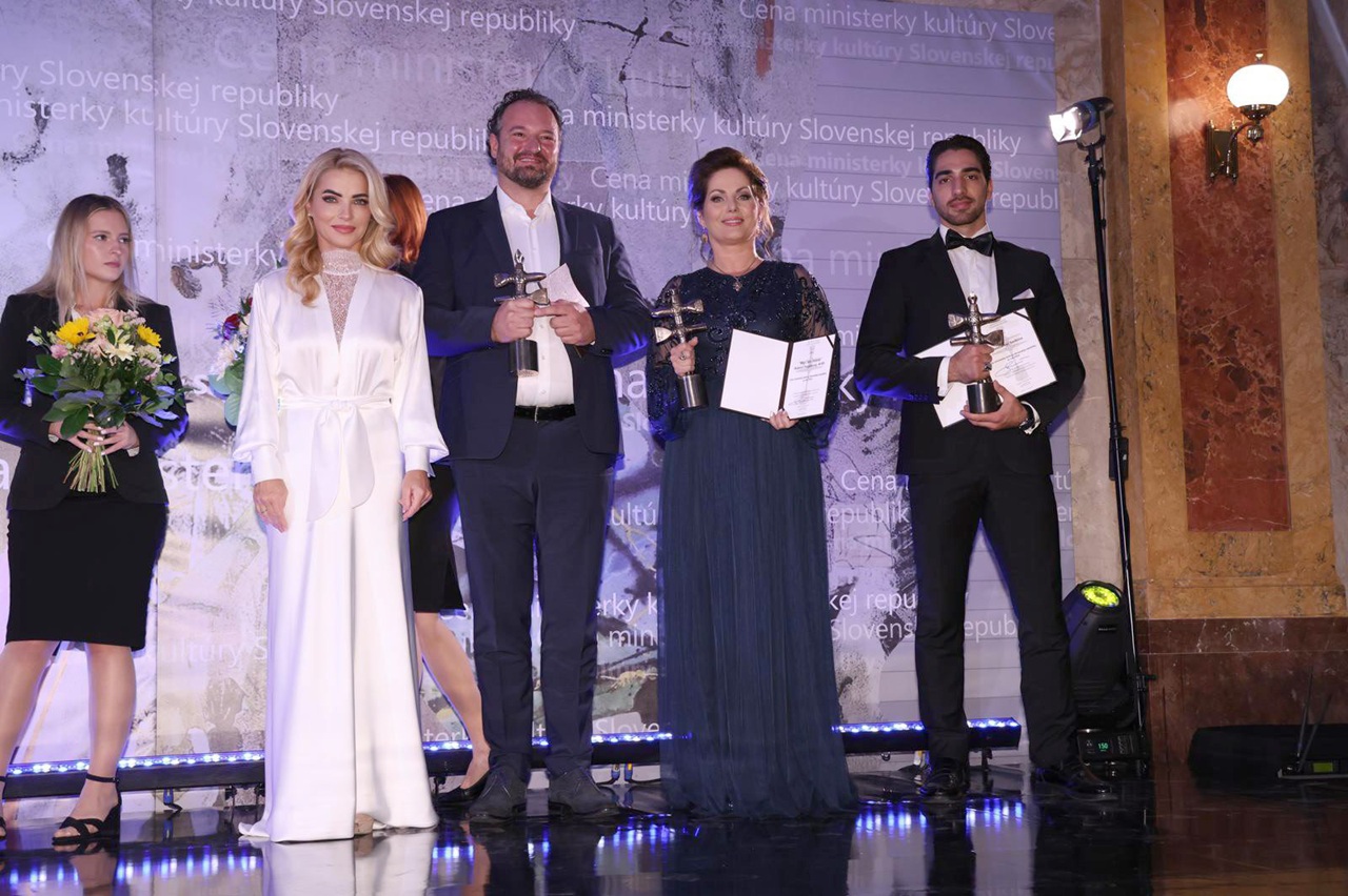 Na snímke laureáti sprava Gennaro Sorbino, Jolana Bubnič Fogašová a Peter Valentovič, ktorým ministerka kultúry SR Martina Šimkovičová (druhá vľavo) odovzdala Ceny ministerky kultúry za rok 2024 vo Dvorane Ministerstva kultúry (MK) SR v Bratislave / Foto: TASR-MK SR