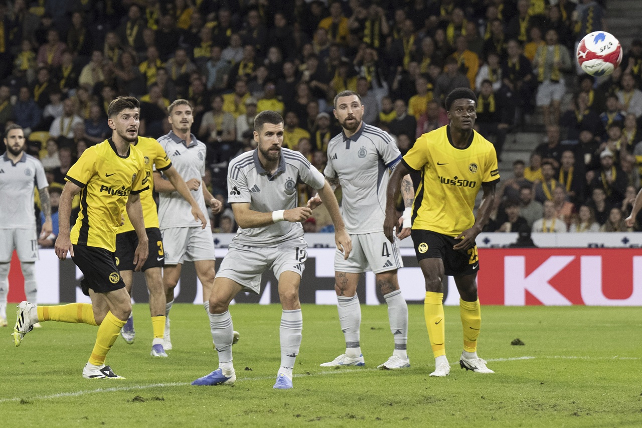 Na snímke Armin Gigovič (vľavo) z Bernu strieľa úvodný gól počas odvetného zápasu play off Európskej ligy vo futbale Young Boys Bern – ŠK Slovan Bratislava / Foto: TASR/AP-Peter Schneider/Keystone via AP