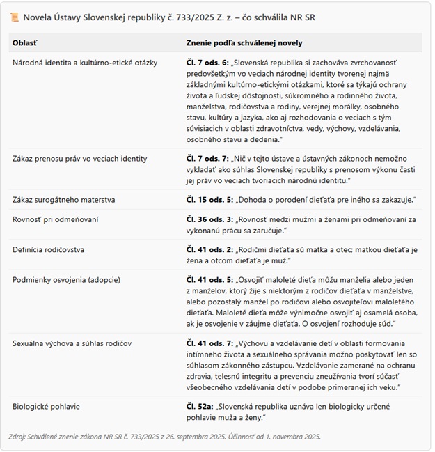 Novela Ústavy Slovenskej republiky č. 733/2025 Z. z., účinná od 1. novembra 2025, rozširuje článok 7 o nové odseky 6 a 7. Tie potvrdzujú, že Slovenská republika si zachováva zvrchovanosť vo veciach národnej identity – najmä v základných kultúrno-etických otázkach, ako sú ochrana života, manželstvo, rodina, jazyk, výchova či verejná morálka.