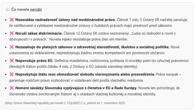 Slovensko neprijalo nič, čo by bolo v rozpore s európskym právom. Iba potvrdilo, že si zachováva ústavnú identitu a suverenitu v kultúrno-etických otázkach – presne tak, ako mu to garantujú zmluvy EÚ.