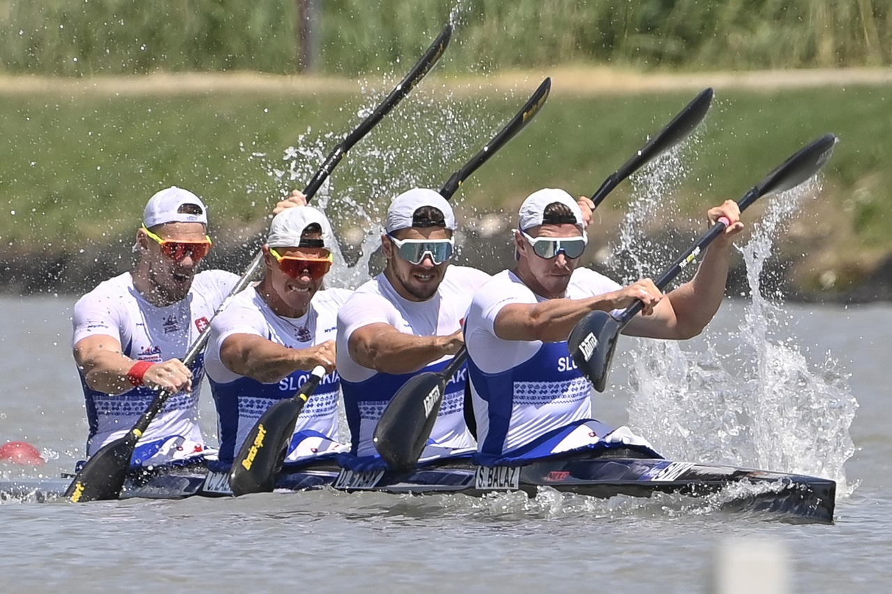 Slovenský štvorkajak v zložení Samuel Baláž, Denis Myšák, Csaba Zalka a Adam Botek vo finále K4 na 500 m na ME v kanoistike v maďarskom Szegede 16. júna 2024. Slováci obsadili siedme miesto