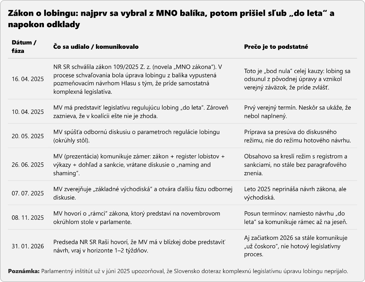 A nakoniec Hlas musí splniť verejný prísľub. Sľub „do leta“ dnes vyzerá ako poistka, aby sa lobing pri MNO zákone nemusel riešiť vôbec.