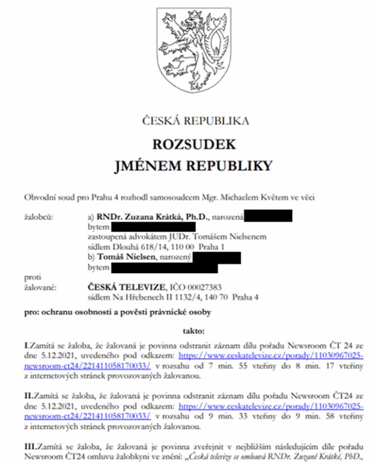 Česká televize opřela naši dehonestaci v pořadu Newsroom o článek z Parlamentních listů „Žádná ochrana. Třetí dávka? Takto. Doktorka boří Babiše i Fialu“, v němž jsem vyjádřila svůj názor na aplikaci třetí dávky vakcíny proti covidu. V článku jsem rozporovala strategii vakcinologů celou společnost naočkovat na podzim 2021 třetí dávkou vakcíny. Citovala jsem různé mezinárodní publikace, dokonce jsem zmínila hypotetickou čtvrtou dávku, ale hlavně jsem hovořila o významu imunity získané po prodělání nemoci. Bohužel, celý obsah článku ani redakci ČT, ani obvodní soud nezajímal. Poprvé si víc než jeho perex přečetli až soudci Městského soudu v Praze v roce 2024!