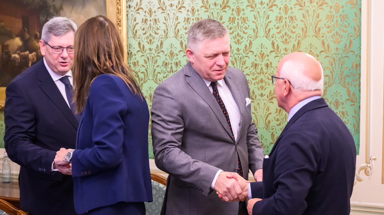 Na snímke sprava predseda Výboru pre občianske slobody, spravodlivosť a vnútorné veci Európskeho parlamentu (LIBE) Jevier Zarzalejos, predseda vlády SR Robert Fico (Smer-SD), šéfka Monitorovacej skupiny pre demokraciu, právny štát a základné práva (DRFMG) Sophie Wilmésová a minister spravodlivosti SR Boris Susko (Smer-SD) počas prijatia monitorovacej skupiny Európskeho parlamentu na Úrade vlády SR v Bratislave 2. júna 2025 / Foto: TASR-Jaroslav Novák