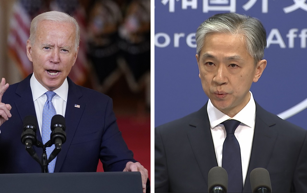 Na snímke americký prezident Joe Biden a hovorca čínskeho ministerstva zahraničných vecíWang Wen-pin