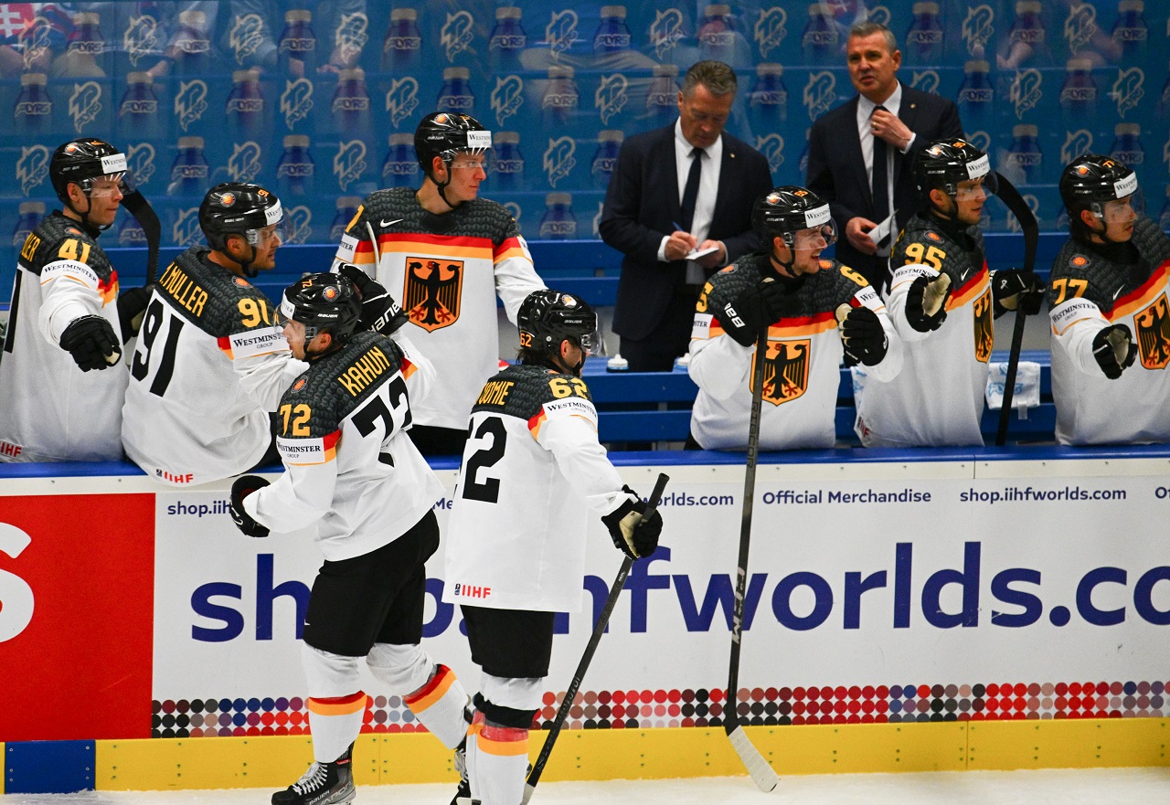 Na snímke nemecký hokejista Dominik Kahun (tretí zľava) sa teší so spoluhráčmi po strelení gólu v zápase základnej B-skupiny Slovensko – Nemecko na 87. majstrovstvách sveta v ľadovom hokeji v Ostrave v piatok 10. mája 2024
