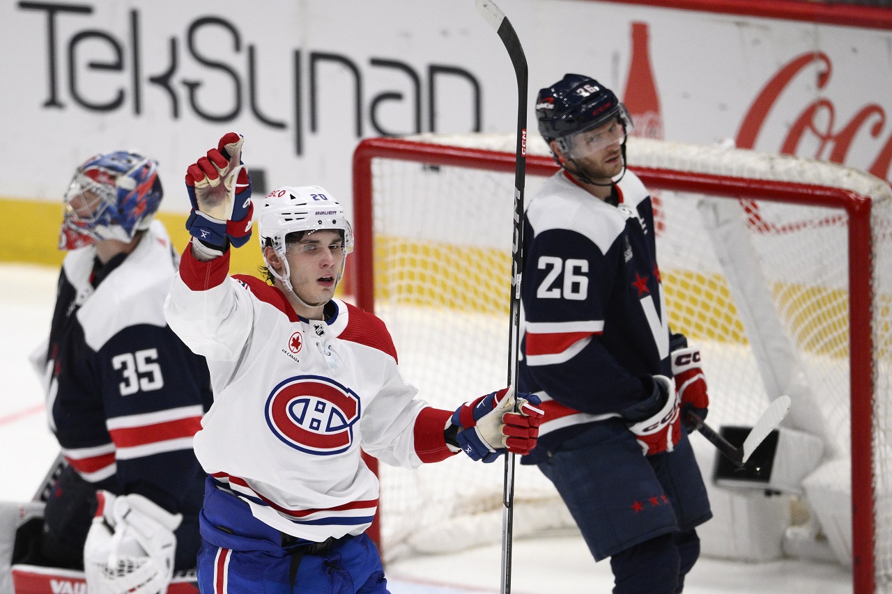 Slovenský hokejista v drese Montrealu Canadiens Juraj Slafkovský (uprostred) sa teší po strelení gólu