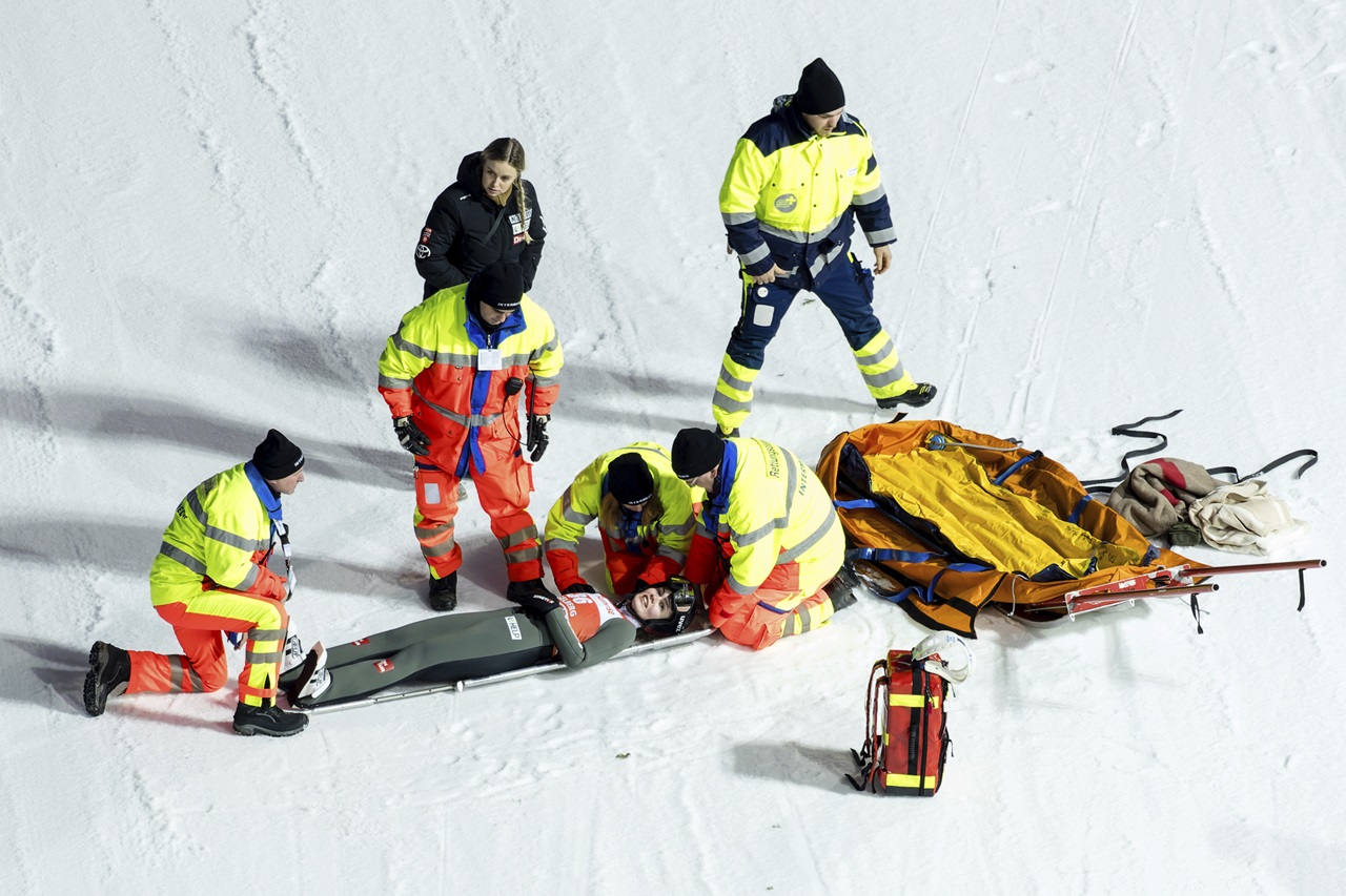 Na snímke zdravotníci ošetrujú nórsku skokanku na lyžiach Annu Odine Strömovú po páde počas súťaže Svetového pohára vo švajčiarskom Engelbergu