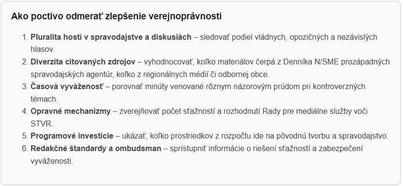 Ak má byť cieľ Programového vyhlásenia vlády o „posilnení verejnoprávnosti“ naplnený, nestačí len odstrániť Havranove nevyvážené „večere“ a rubriku Overovňa z dielne Hodásovej Infosecurity. Potrebné sú aj merateľné ukazovatele.