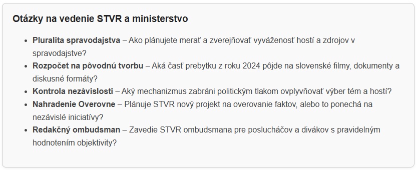 Treba však zdôrazniť, že ukončenie relácie Večer s Havranom a rubriky Overovňa nastalo až v roku 2025, teda nie sú súčasťou programových zmien zachytených vo Výročnej správe za rok 2024. Samotná správa bola spracovaná v marci 2025 a odráža ešte stav v roku 2024 – v období, keď Rada STVR nebola kompletná a nová generálna riaditeľka Martina Flašíková ešte nebola vo funkcii.