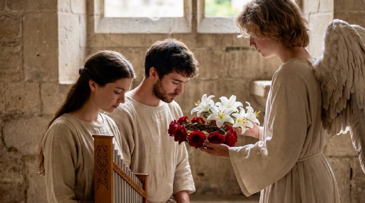 Najstaršie historické zmienky o svätej Cecílii boli zaznamenané v Martyrologium Hieronymianum, a to znamená, že rímska cirkev oslavovala svätú Cecíliu už v 4. storočí. V aktách z polovice 5. storočia o mučeníckej smrti svätej Cecílie je uvedené, že pochádzala zo senátorskej rodiny a už od detstva bola kresťankou. Rodičia jej podľa zvyku vybrali ženícha primeraného postavenia, nehľadiac na to, že ide o pohana. Cecília však túžila celá patriť Kristovi a v tom smere už skôr urobila sľub. Dôvernou modlitbou riešila to, v čom by iný videl neprekonateľný problém. Ako poslušná dcéra pristúpila k svadbe s Valeriánom, avšak hneď po obrade poslala Cecília, na pokyn anjela, svojho novomanžela k tretiemu míľniku na Apijskú cestu, kde ho pápež Urban pokrstil. Valerián, hneď ako sa ako kresťan vrátil k Cecílii, spoločne s ňou mal videnie vznášajúceho sa anjela, ktorý oboch novomanželov korunoval ružami a ľaliami. Detaily týkajúce sa vplyvu Cecílie na obrátenie jej snúbenca sú zrejme neskorším doplnkom. Isté je, že tu hrala najpodstatnejšiu úlohu modlitba a Božia milosť.