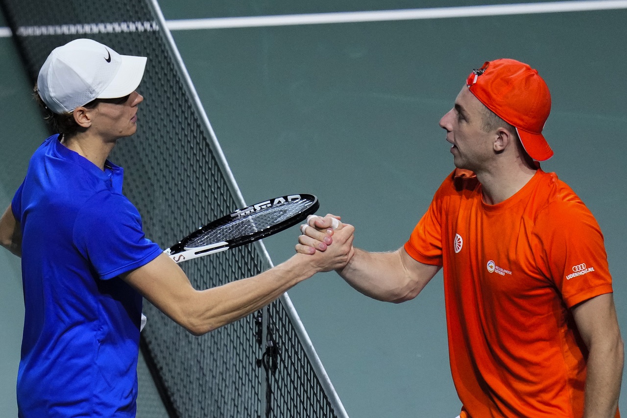 Taliani pritom nevstúpili do zápasu dobre, keď v úvodnej dvojhre Matteo Arnaldi prehral s Boticom van de Zandschulpom po dramatickom boji 7:6 (6), 3:6 a 6:7 (7). Následne si však štvrtý hráč svetového rebríčka Jannik Sinner poradil v súboji tímových jednotiek s Tallonom Griekspoorom 7:6 (3), 6:1 a vyrovnal stav štvrťfinálového duelu na 1:1. O všetkom tak musela rozhodnúť záverečná štvorhra, v ktorej Jannik Sinner s Lorenzom Sonegom zdolali duo Tallon Griekspoor, Wesley Koolhof 6:3, 6:4 a poslali Talianov medzi najlepšiu štvorku.