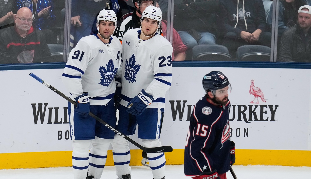 Na snímke center Toronto Maple Leafs John Tavares (91) oslavuje svoj 500. gól v kariére so spoluhráčom Matthewom Kniesom (23) za obrancom Columbus Blue Jackets Dante Fabbro (15) v tretej tretine hokejového zápasu NHL v Columbuse / Foto: SITA/AP-Sue Ogrocki