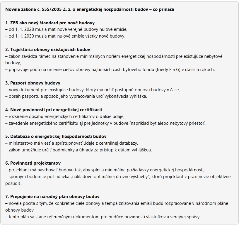 Najvýraznejšou zmenou je požiadavka, aby nové budovy spĺňali definíciu budovy s nulovými emisiami (ZEB). Znie to jednoducho, no ani tvorcom novely nie je jasné, či sa tým myslia len priame emisie, alebo aj nepriame emisie z výroby elektriny. Pri slovenskej energetickej štruktúre ide o zásadný rozdiel. Pripomienky verejnosti upozorňujú, že pri nesprávnom výklade sa môžu dostať mimo hry technológie, ktoré dnes používajú státisíce domácností.