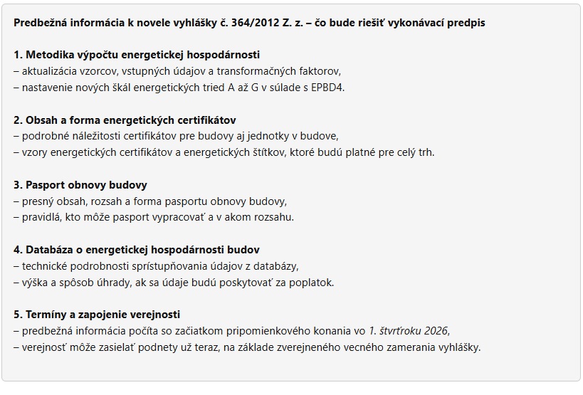 Zákon je len rámec. Skutočné povinnosti, dopady aj náklady určí až vykonávacia vyhláška, ktorá má byť predmetom pripomienkového konania až v roku 2026. Práve tá rozhodne o tom, aké transformačné faktory energií sa budú používať, kde sa určia presné hranice energetických tried od A po G, čo bude obsahom pasportu obnovy, aké podmienky bude musieť spĺňať energetický certifikát a aké poplatky zaplatia občania za prístup k pripravovanej centrálnej databáze energetických údajov.
