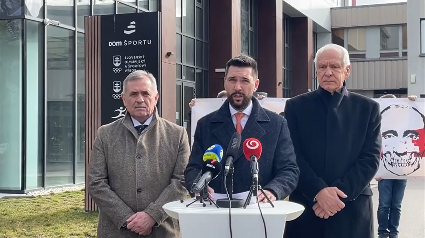 Poslanci zo strany Smer-SD Richard Takáč, Dušan Galis a Viliam Záhorčák dnes ráno (22.2.) organizovali tlačovú konferenciu pred budovou Domu športu v Bratislave na podporu štartu ruských a bieloruských športovcov na olympiáde.