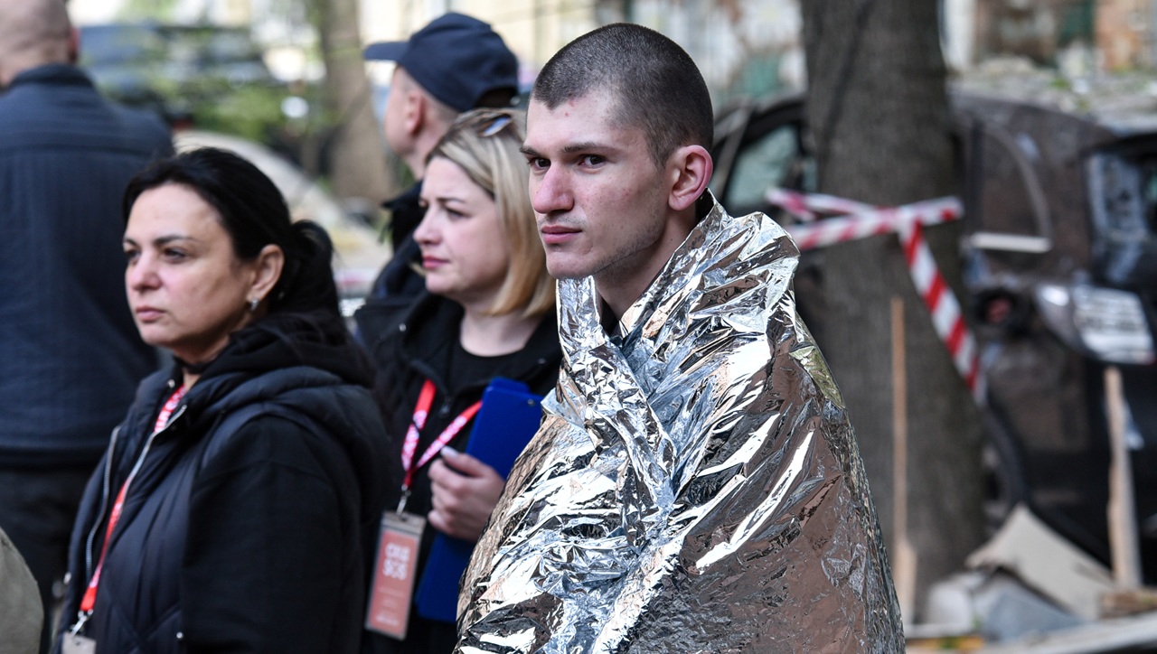 Na snímke miestny muž sa zakrýva termálnou prikrývkou pred zničeným obytným domom po ruskom raketovom útoku v meste Dnipro, na východe Ukrajiny / Foto: TASR/AP-Mykola Synelnykov