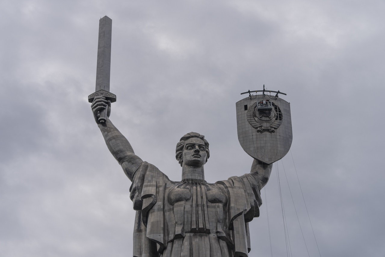 Na snímke zamestnanci pripravujú odstránenie sovietskeho znaku zo štítu pamätníka Matka vlasť v Kyjeve na Ukrajine