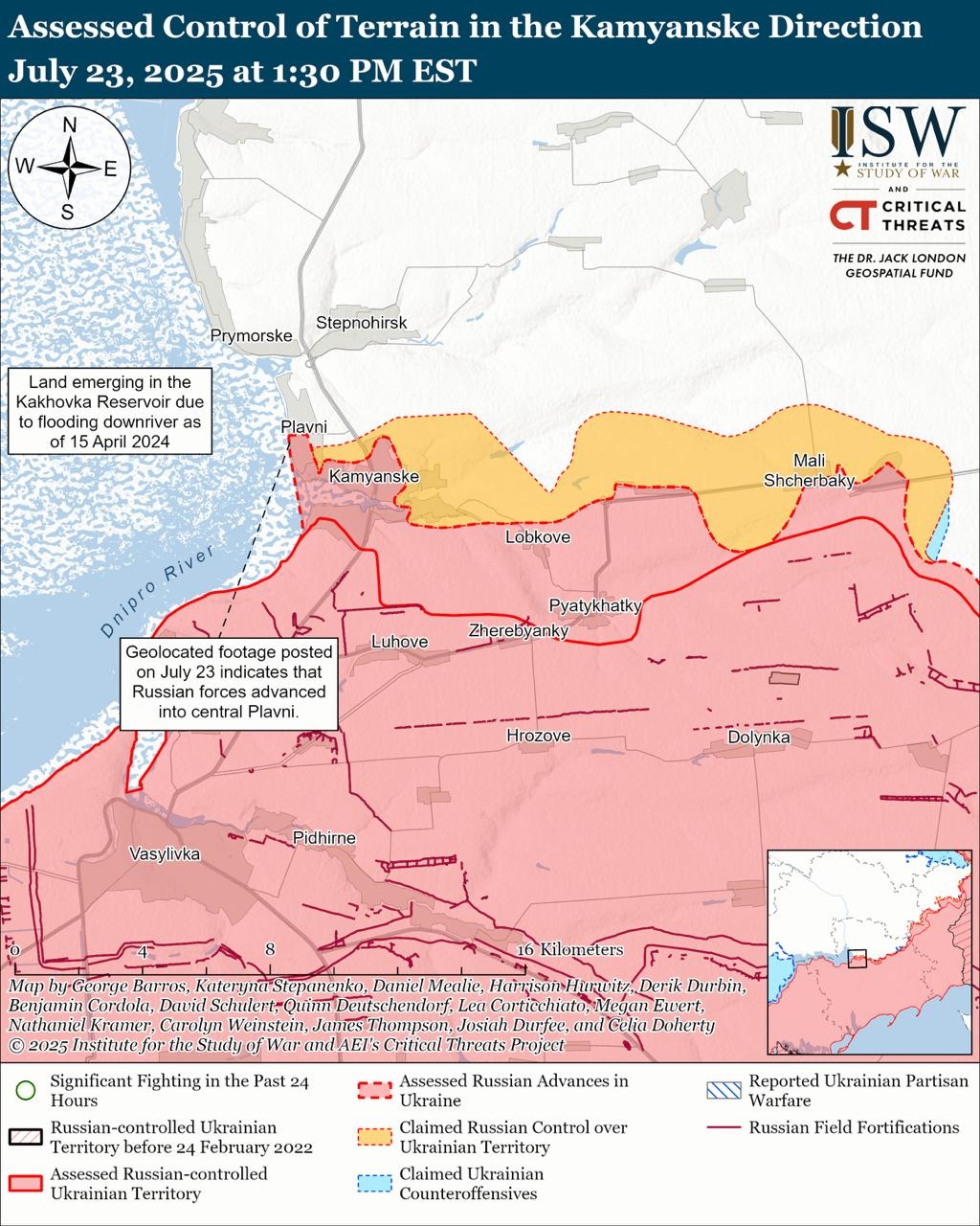 Deep State nepotvrdzuje postup Rusov v tejto oblasti. Americký „Inštitút pre štúdium vojny“ včera informoval o postupe Rusov v centre Plavnej, severozápadne od Kamenského, ako aj o útokoch v smere na Stepnogorsk.