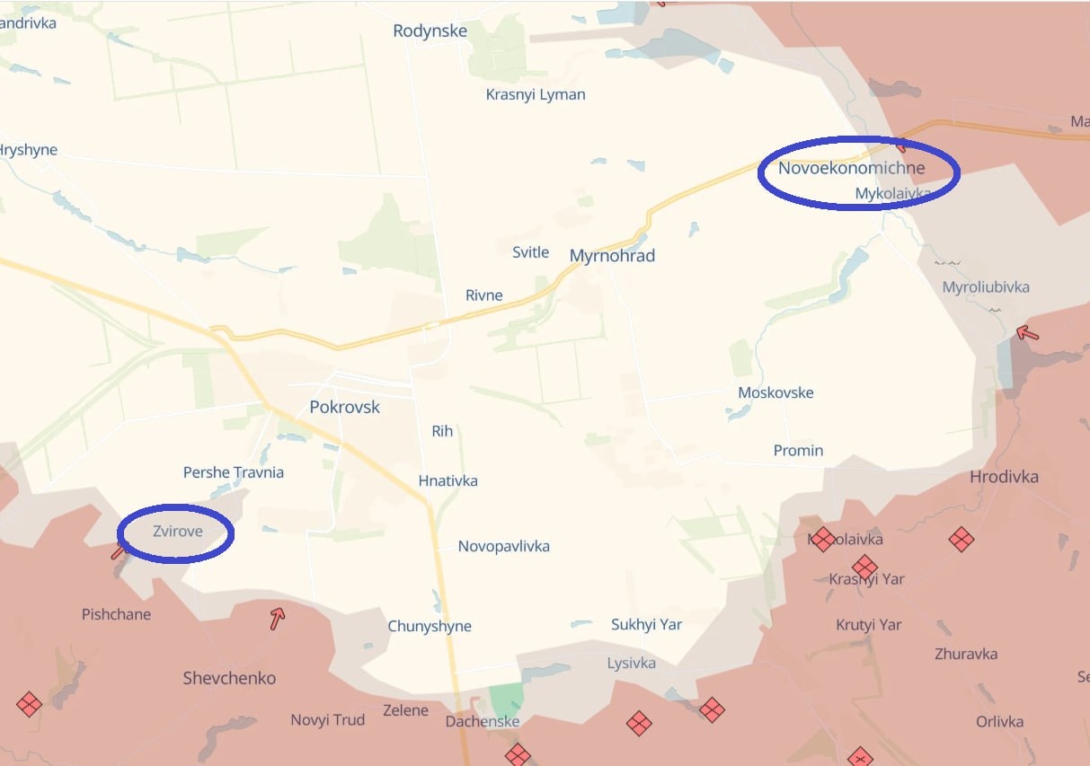 Novoekonomičeskoje sa nachádza na východných prístupoch k Mirnogradu, a Zverevo juhozápadne od Pokrovska.