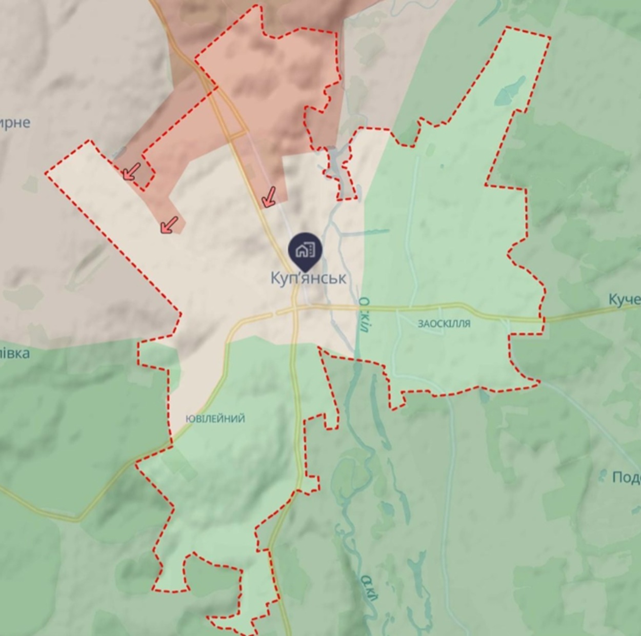 Na mape Deep State je približne polovica Kupjanska označená ako pod kontrolou RF alebo v šedej zóne.
