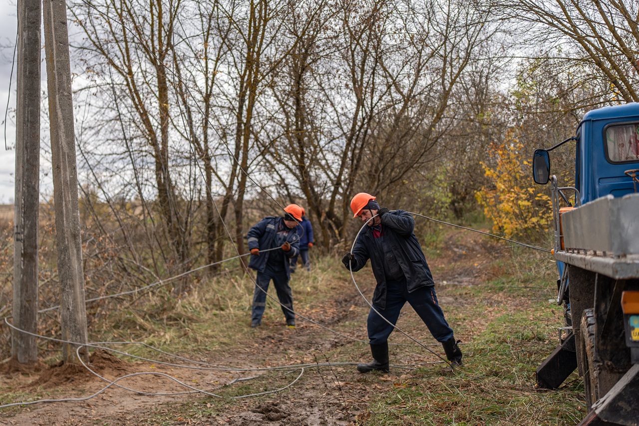 Na snímke pracovníci opravujú elektrické vedenie počas výpadku elektriny v ukrajinskom meste Šostka / Foto: TASR/AP-Julia Demaree Nikhinson