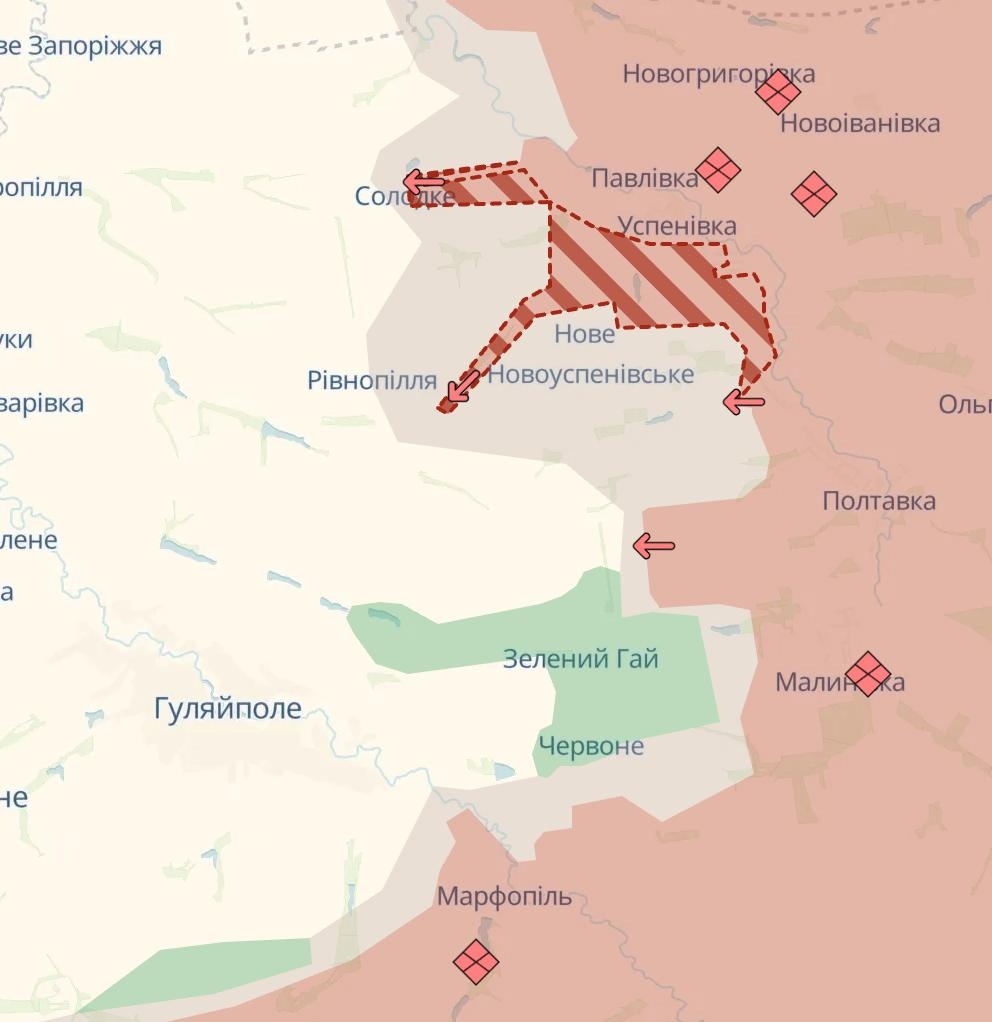 Tiež sa uvádza, že ozbrojené sily Ruskej federácie vyvíjajú tlak na Novoye a Novouspenovskoye a postupne postupujú smerom k Rovnopolu. To predstavuje hrozbu pre Gulajpol, pretože sa otvára nový operačný smer zo severu, čo komplikuje obranu pozícií v Zelenom Gaji a Vysokom.