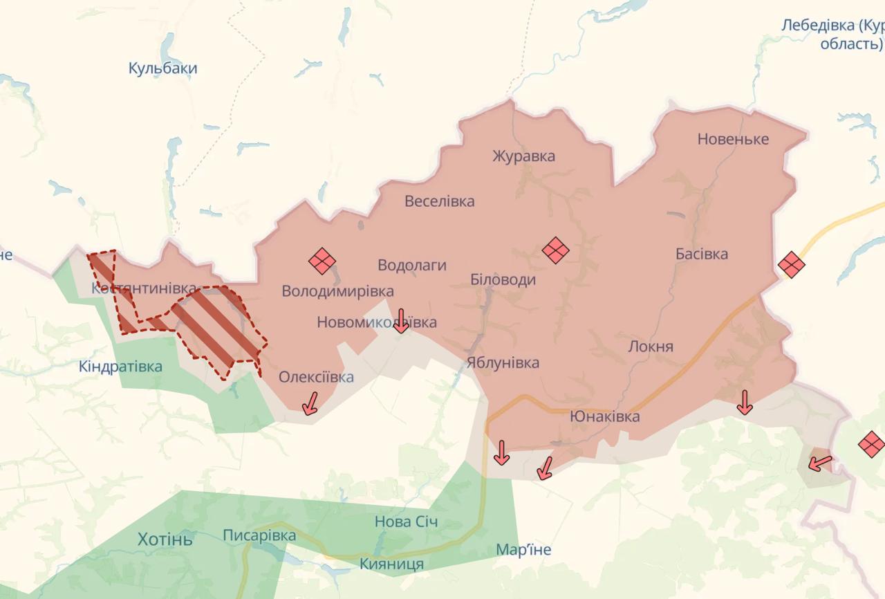 9:30 – Armáda Ruskej federácie po dlhej prestávke pokračuje v postupe v Sumskom regióne, ako svedčí mapa Deep State.
