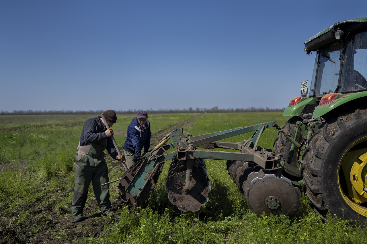 Na snímke farmári odstraňujú blato z pluhu traktora počas zberu úrody na poli v obci Potomkyne v Chersonskej oblasti na juhovýchode Ukrajiny
