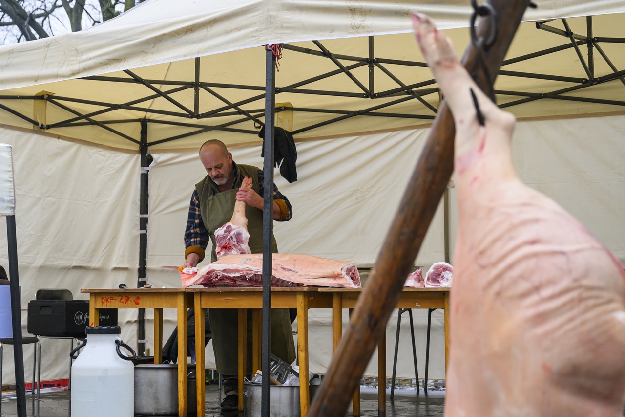 Na snímke predavač ukazuje klobásy a hurky na Smižianskej zabíjačke v sobotu 7. februára 2025 v obci Smižany / Foto: TASR-Michal Svítok