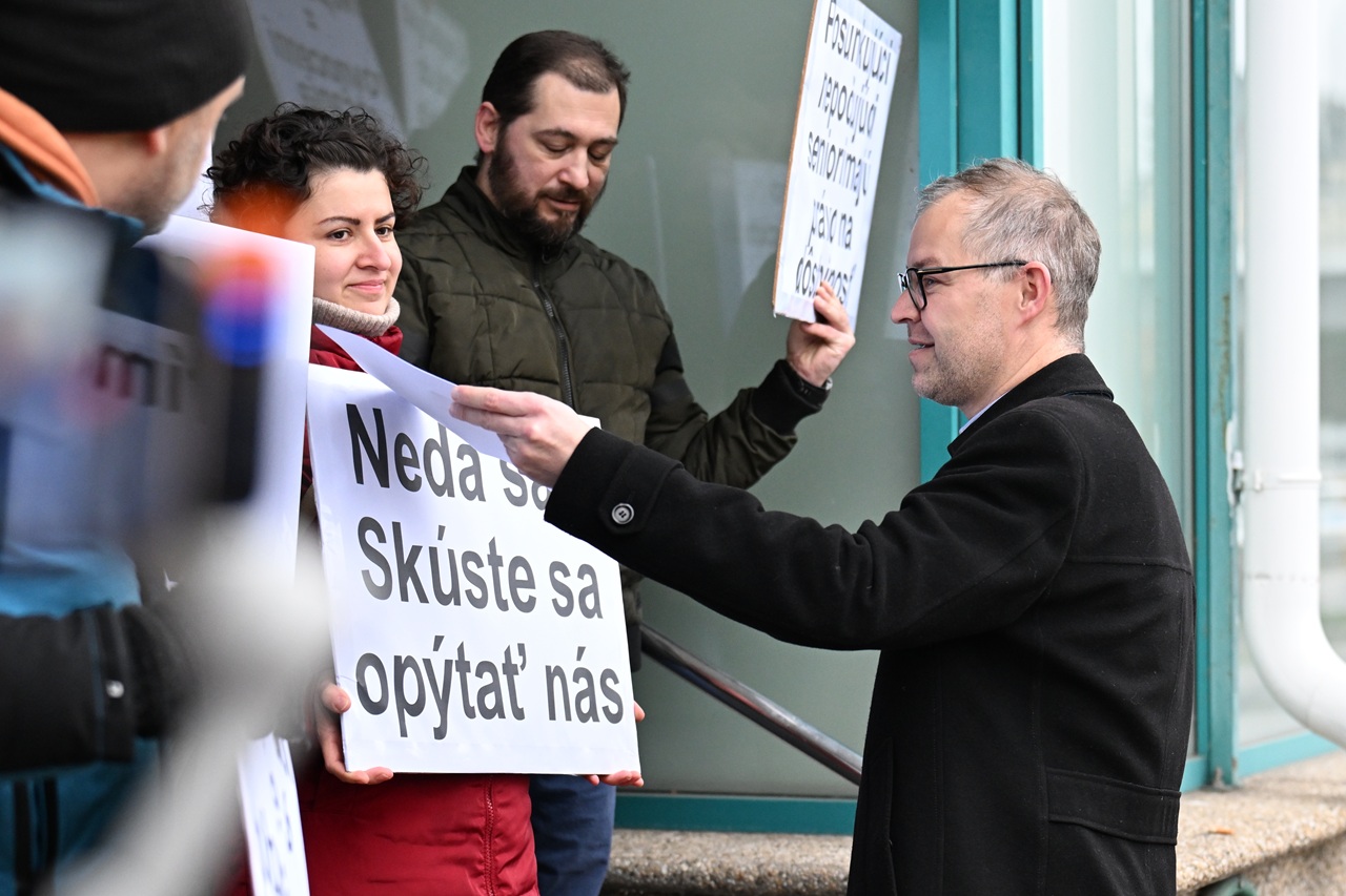 Na snímke vpravo zástupca riaditeľa TTSK Ján Bučan odovzdáva protestujúcim podklady k rokovaniu počas protestného zhromaždenia Nepočujúcich občanov proti postupu Trnavského samosprávneho kraja (TTSK) v Trnave v pondelok 22. decembra 2025 / Foto: TASR-Lukáš Grinaj