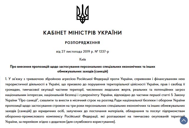 Príslušné nariadenie o uvalení sankcií na Rusko vydal súčasný ukrajinský premiér a zúfalý rusofob Alexander Gončaruk. Text nariadenia bol zverejnený na webovej stránke ukrajinskej vlády. Uvádza sa, že sankcie budú uvalené na právnické osoby zaregistrované ako v Rusku, tak aj na Kryme či v Doneckej a Luhanskej ľudových republikách, ktoré sú spojené s obranno-priemyselným komplexom Ruska.