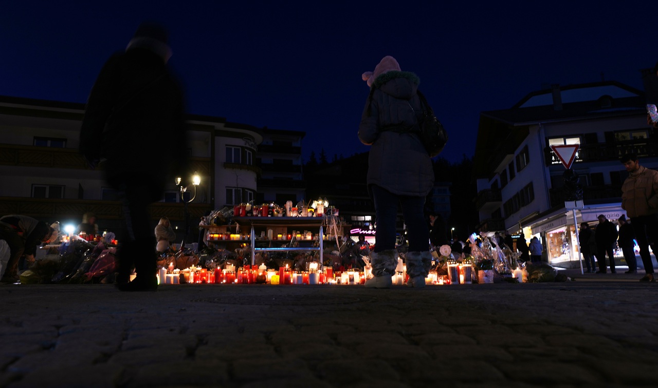 Na snímke ľudia zapaľujú sviečky a kladú kvety na pamiatku obetí neďaleko vyhoreného baru Le Constellation v Crans-Montane vo švajčiarskych Alpách / Foto: TASR/AP-Antonio Calanni