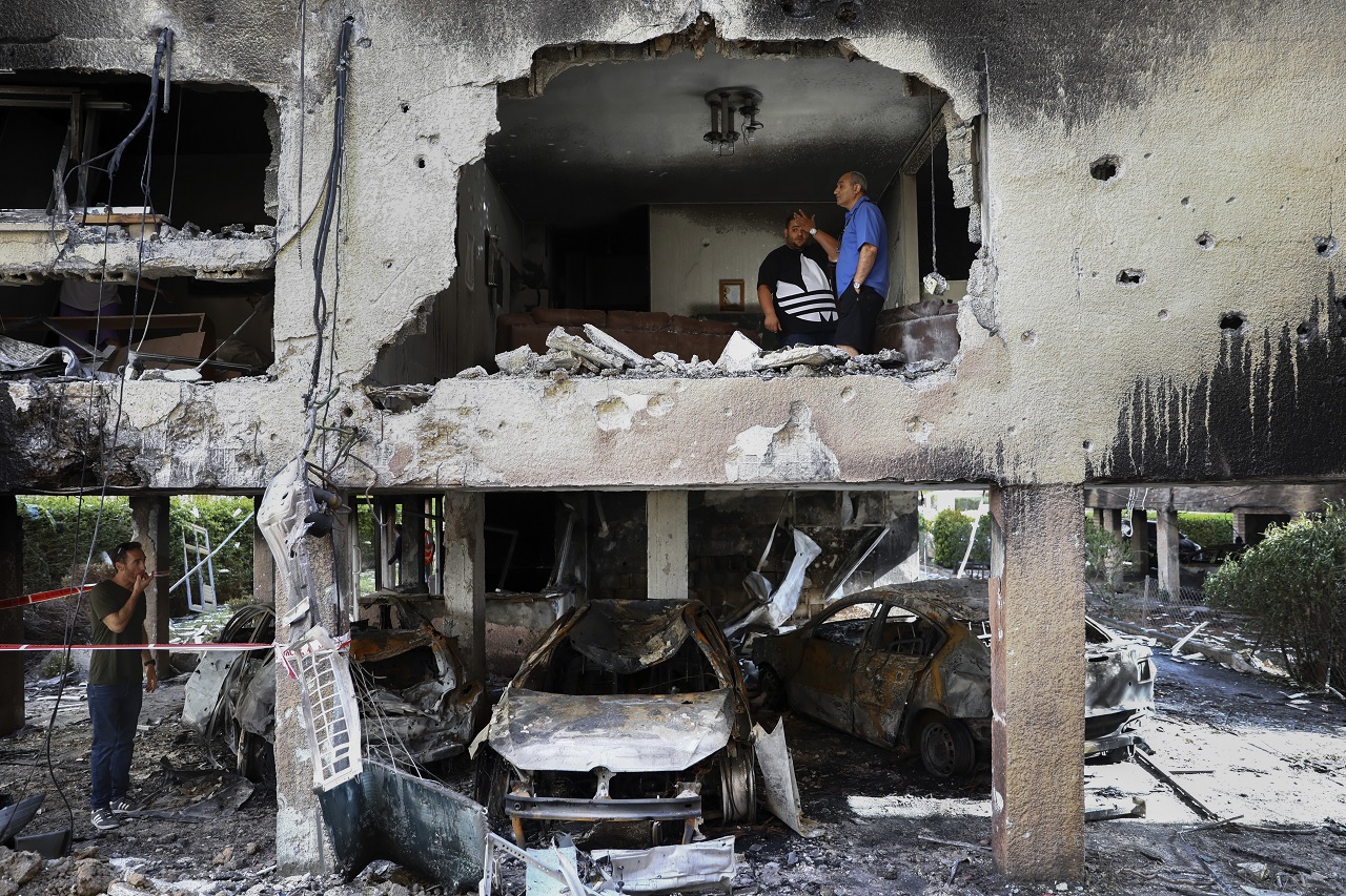 Ľudia prehľadávajú zničený byt po raketovom útoku na budovu z pásma Gazy v izraelskom meste Petach Tikva 13. mája 2021