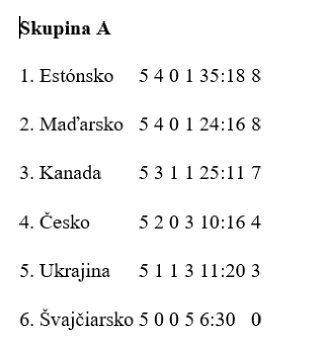 Do kategórie A, kde ešte pokračujú boje v skupinách, postúpilo mužstvo Estónska a na budúci rok sa ocitne medzi najlepšími 8 tímami sveta. Terajšie majstrovstvá sveta sa skončia 2. februára a ak nedôjde k veľkému prekvapeniu, vo finále sa stretne Rusko a Švédsko.