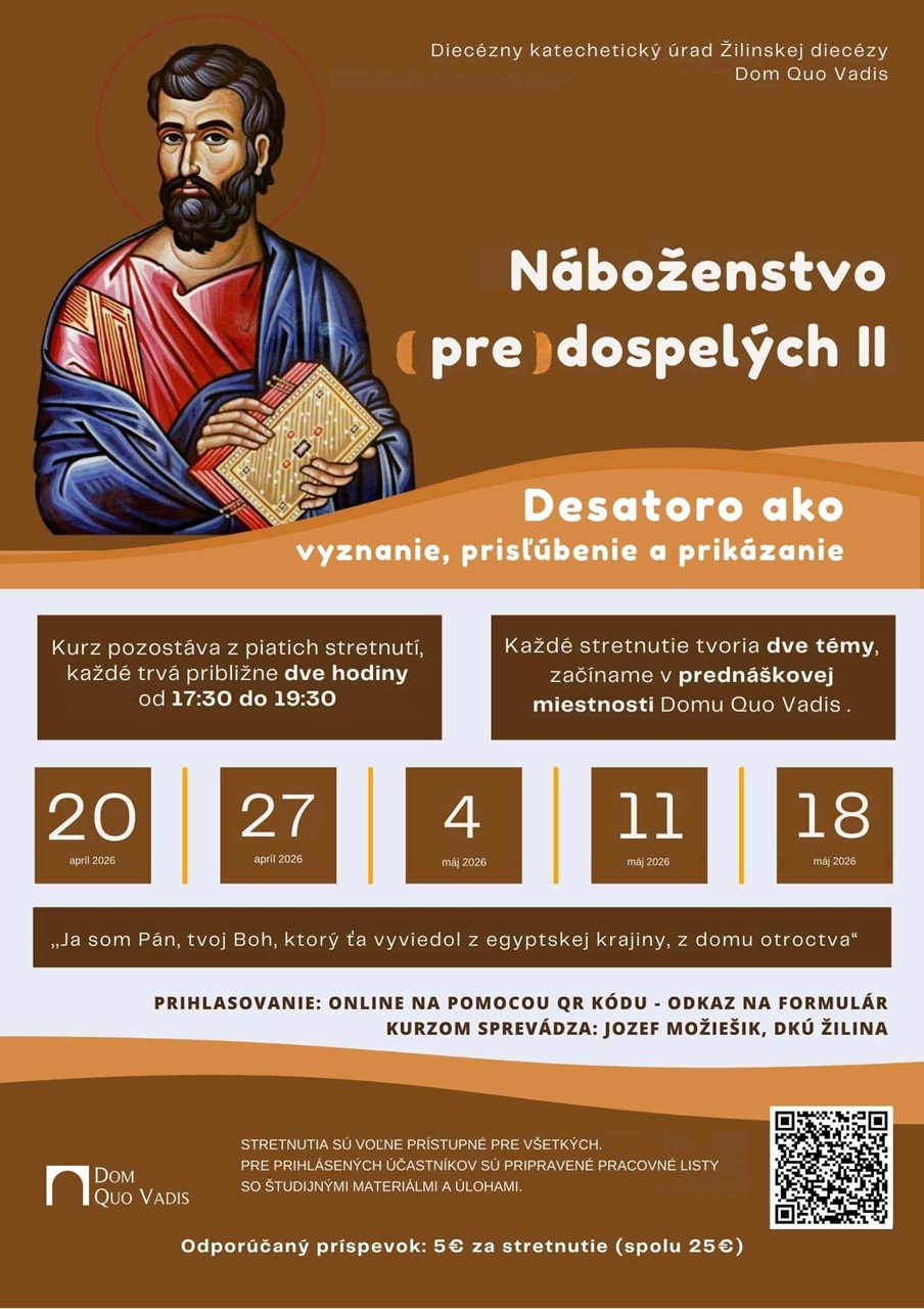 Programom bude sprevádzať Jozef Možiešik, riaditeľ Diecézneho katechetického úradu v Žiline. Stretnutia sa budú konať počas pondelkov (20. 4., 27. 4., 4. 5., 11. 5. a 18. 5. 2026) vždy o 17:30 v Dome Quo Vadis v Bratislave. Účastníci získajú k štúdiu pracovné listy, doplňujúce materiály a k dispozícii bude aj tematický podcast.