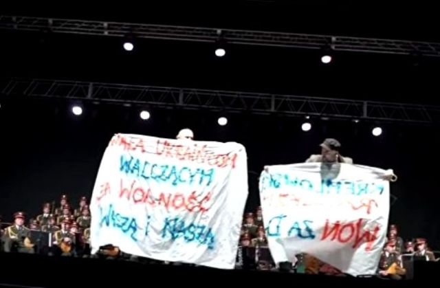 V piatok, 7. decembra, dvaja ukrajinskí aktivisti vyskočili na scénu počas vystúpenia armádneho súboru piesní a tanca Alexandrovci v poľskom meste Bydgosz a pokúsili sa prekaziť koncert. Video uverejnila stránka oko.press.
