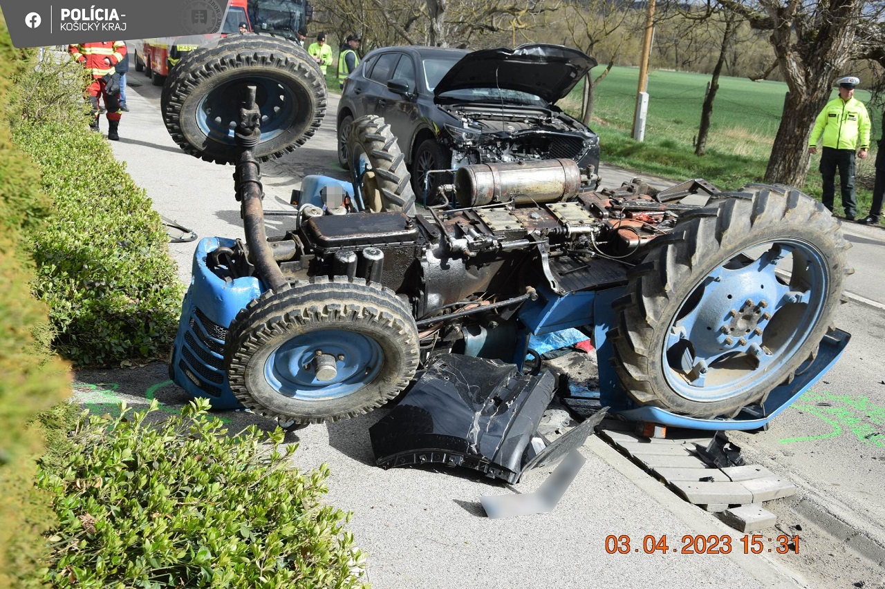 Na snímke prevrátený traktor po zrážke s osobným vozidlom v okrese Košice – okolie