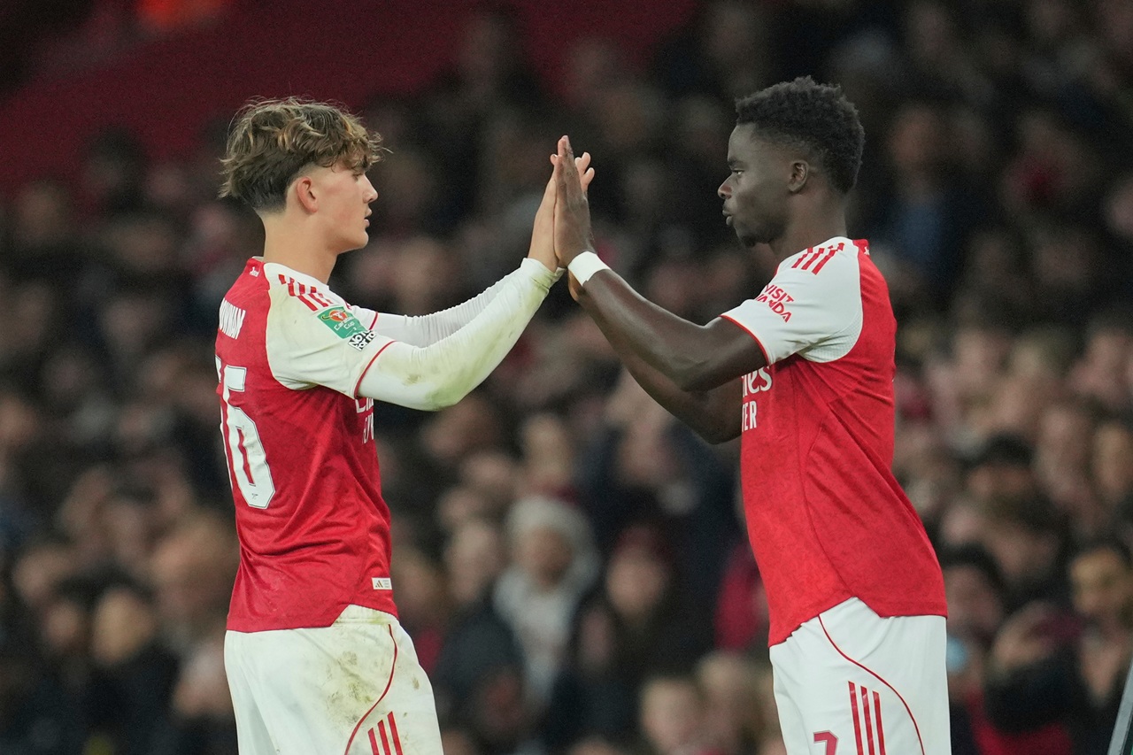 Na snímke Max Dowman z Arsenalu (vľavo) je nahradený Bukayom Sakom z Arsenalu počas futbalového zápasu Anglického ligového pohára medzi Arsenalom a Brighton Brighton and Hove Albion FC v Londýne / Foto: SITA/AP-Kin Cheung