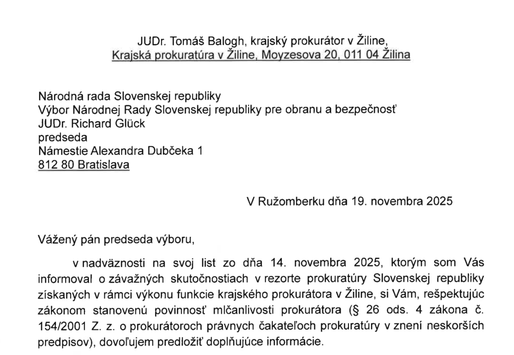 Prvý list adresovaný výboru pre obranu a bezpečnosť a ktorý jeho predseda na mimoriadnom zasadnutí vo štvrtok 20. októbra prečítal, upozornil na to, že vedenie generálnej prokuratúry podľa jeho autorov vstupovalo do živých trestných konaní spôsobom, ktorý prekračoval rámec zákonného dozoru.