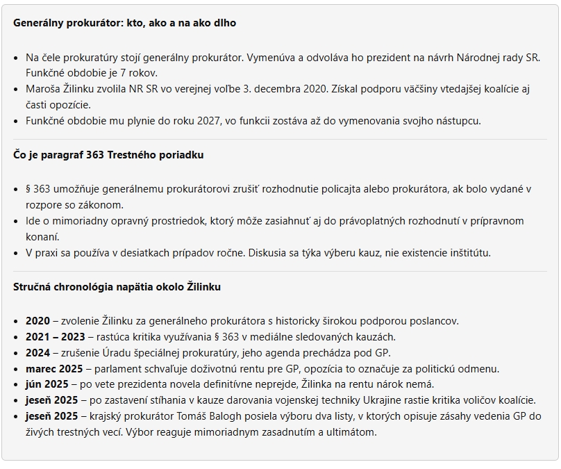 K napätiu výrazne prispelo aj to, že parlament odmietol doživotnú rentu pre generálneho prokurátora. V Žilinkovom okolí to nebolo vnímané ako technické hlasovanie, ale ako úder jeho autorite. Odvtedy sa v koalícii ozývajú hlasy, že niektoré rozhodnutia GP pôsobia ako akt pomsty. V citlivých kauzách dôležitých pre vládu vidia poslanci spomalenie, neochotu a signály osobnej reakcie, nie profesionálnu neutralitu.