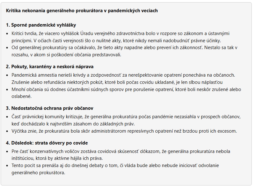 Frustrácia medzi voličmi koalície má hlbšie korene. Generálna prokuratúra počas pandémie nepodnikla podľa nich dostatočné kroky voči vyhláškam a obmedzeniam, ktoré boli súdmi aj odborníkmi opakovane spochybnené a v niektorých prípadoch označené za nejasné, nepreskúmateľné alebo diskutované v pojme „nulita“.