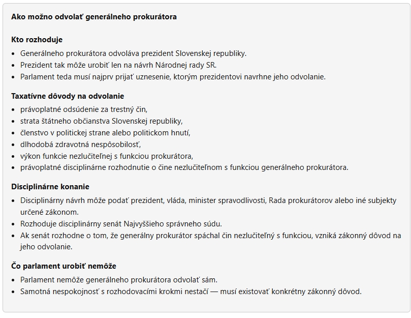Odvolanie generálneho prokurátora nie je politické rozhodnutie, ale právny proces. Parlament ho nemôže odvolať hlasovaním. Disciplinárne konanie možno začať len vtedy, ak existuje konkrétne podozrenie na disciplinárne previnenie prokurátora. Musí ísť o konkrétny skutok alebo postup, ktorý možno preskúmať disciplinárnym senátom.